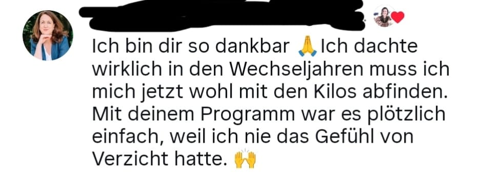 Ich finde das Programm wirklich super. Ich hab mich in diesen 8 Wochen nicht nur zum Thema Abnehmen weiter entwickelt, sondern auch in anderen Themen die mich teilweise belastet haben. Man wird von dir so toll begleitet und wertgeschätzt. Egal welches Thema, man kann alles ansprechen und es wird ernst genommen – das war für mich wirklich ganz besonders.